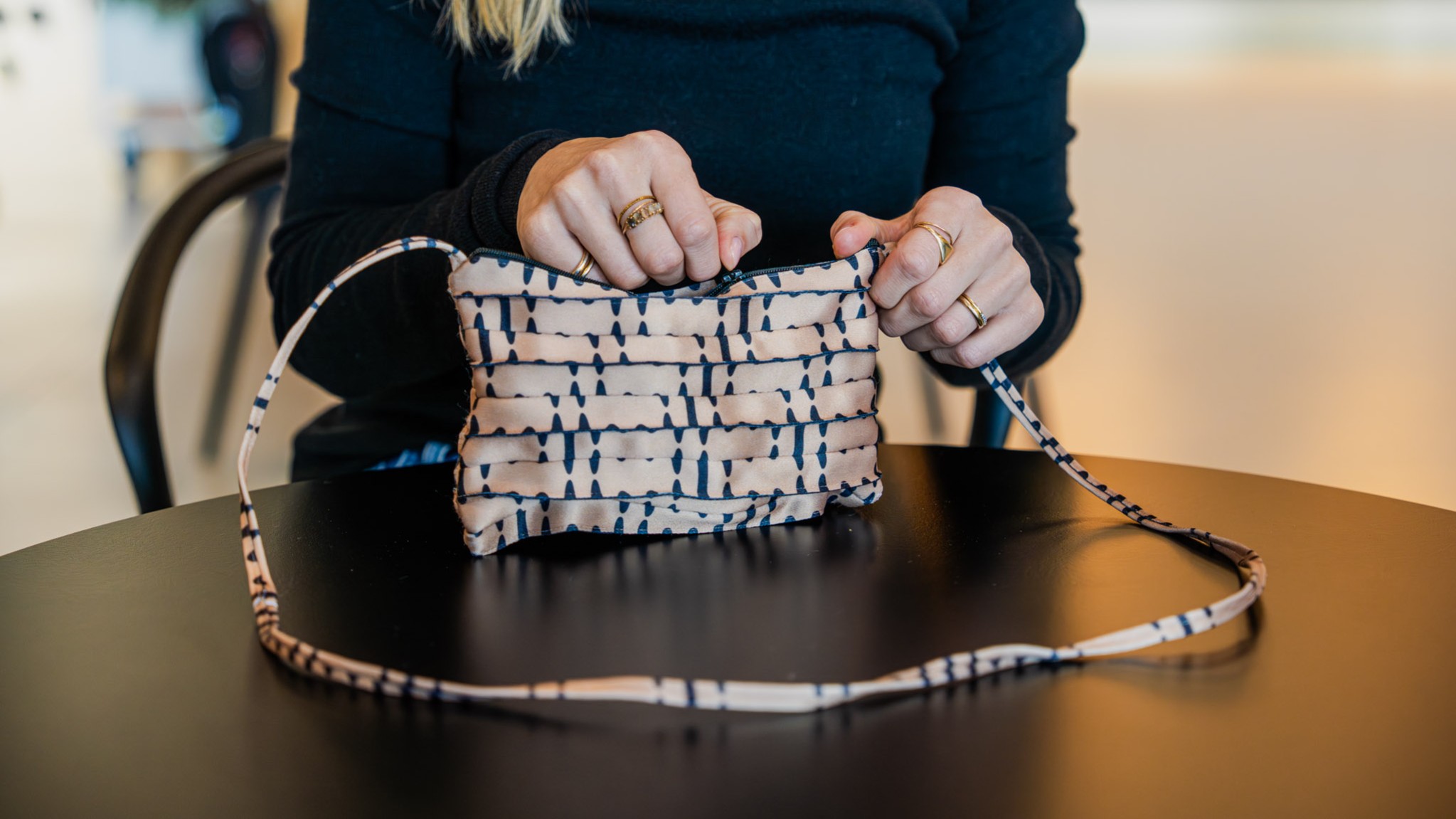 Mit viel Gespür für Material und Gestaltung werden die Lanyards gereinigt, sortiert und in liebevoller Handarbeit weiterverarbeitet. Die charakteristische Falttechnik verleiht den Produkten ihren unverwechselbaren Look. Keine Kombination gleicht der anderen – jedes Design entsteht aus dem individuellen Mix der Bänder.